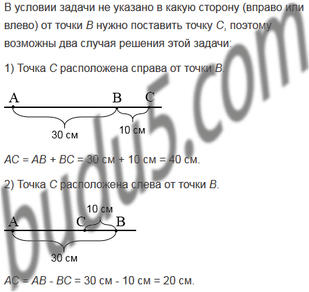 Точки А, В и С лежат на одной прямой. Расстояние между точками А и В равно 30 см, а между точками В и С - 10 см. Найдите расстояние между точками А и С.